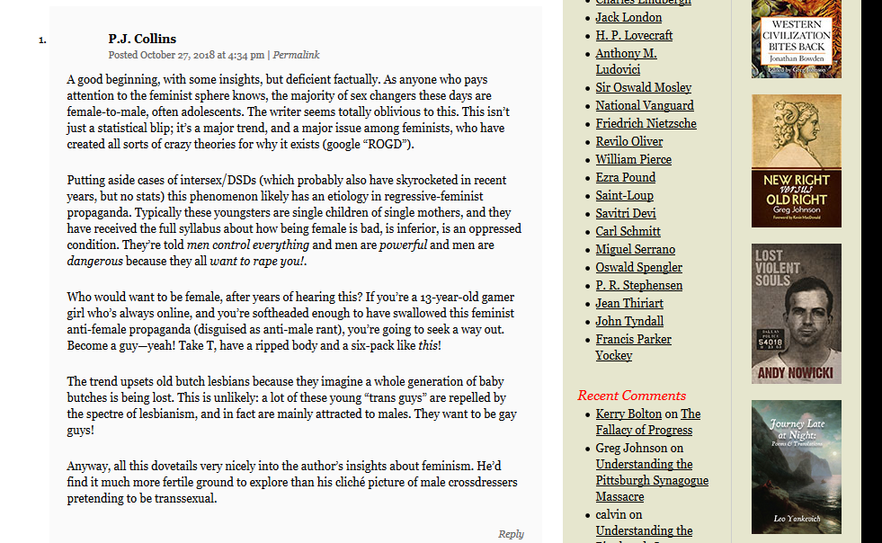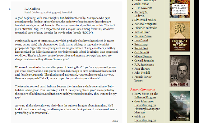 As some readers of this blog will know, my article on the current battle between transsexuals and feminists has been reposted on the Counter Currents website with my consent. I do not approve of all who write on there, but equally, there are also very good articles published. My articles appear on many websites across the net, but this does not necessarily mean that I endorse the website in question. Certainly, some websites have copied my articles without asking for consent first. Onto the point: there was a flurry of comments to the article, some of which were of a very dubious nature for one reason or another. As people have no doubt realised, I moderate comments quite strictly on here. People are more than welcome to debate with me and I will happily concede points in light of better information, but I expect references so that information given can be verified. I do not usually engage in the comments sections underneath my articles on other websites that publish them, but the comments left to the article I have mentioned are so egregious I feel I have to address some of them. This brings me nicely onto the first dubious commenter:
